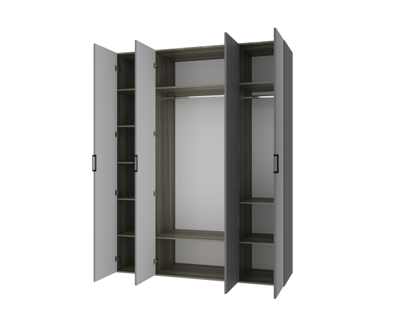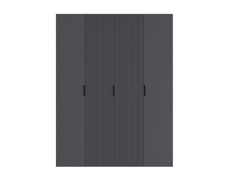 Четыре распашных фасада из матового МДФ «Хангва» образуют спокойное полотно, которое сочетается с корпусом цвета «Джара темная». Благодаря ширине 1772 мм шкаф воспринимается как полноценная гардеробная система — матовая фактура «съедает» лишний объем и делает модель визуально легче.